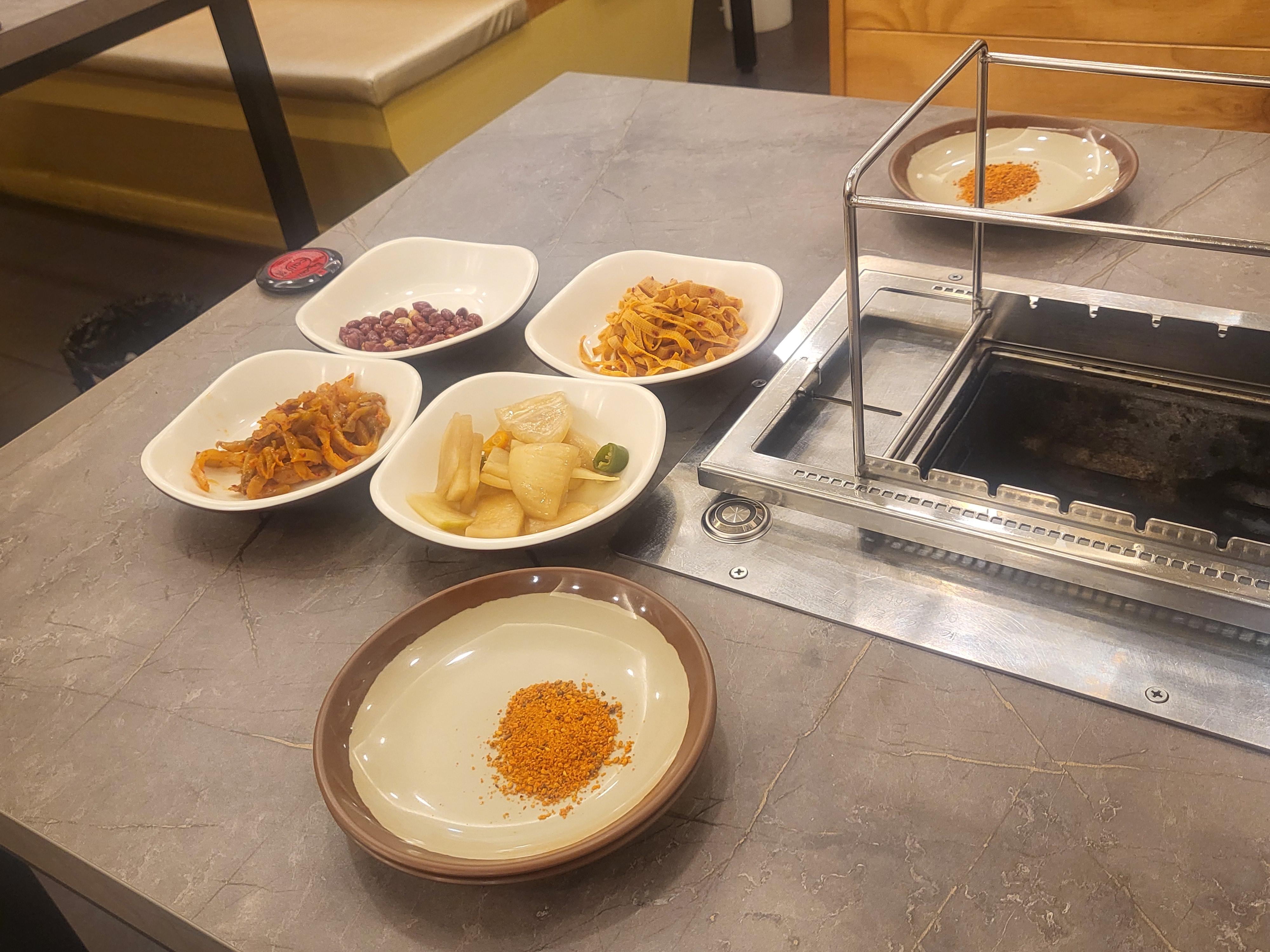 저희는 무한리필 모듬꼬치 16900원으로 주문했고요. 숯불 피워져 나오는 시간이 좀 걸려요. 밑반찬이 먼저 나옵니다.