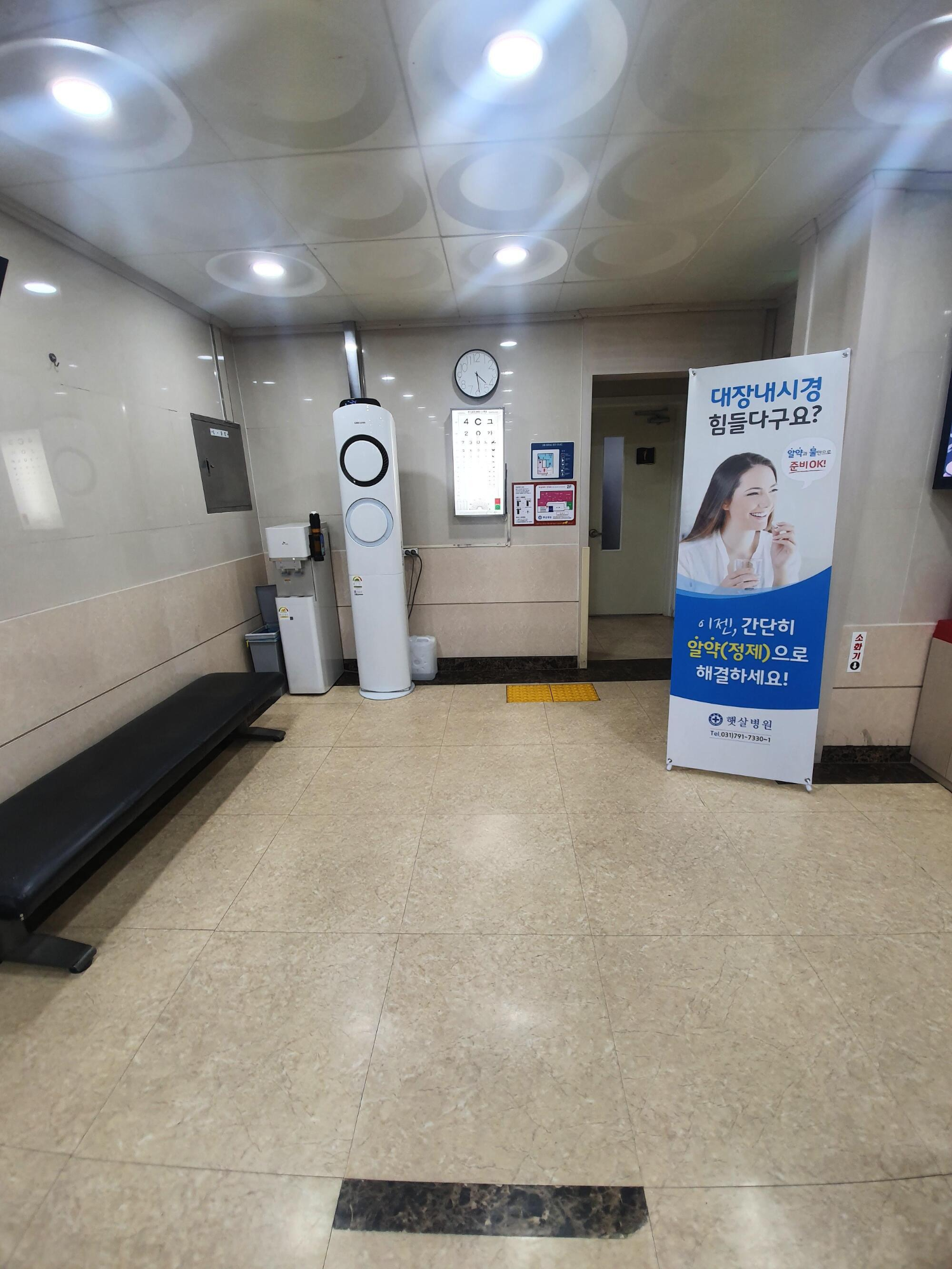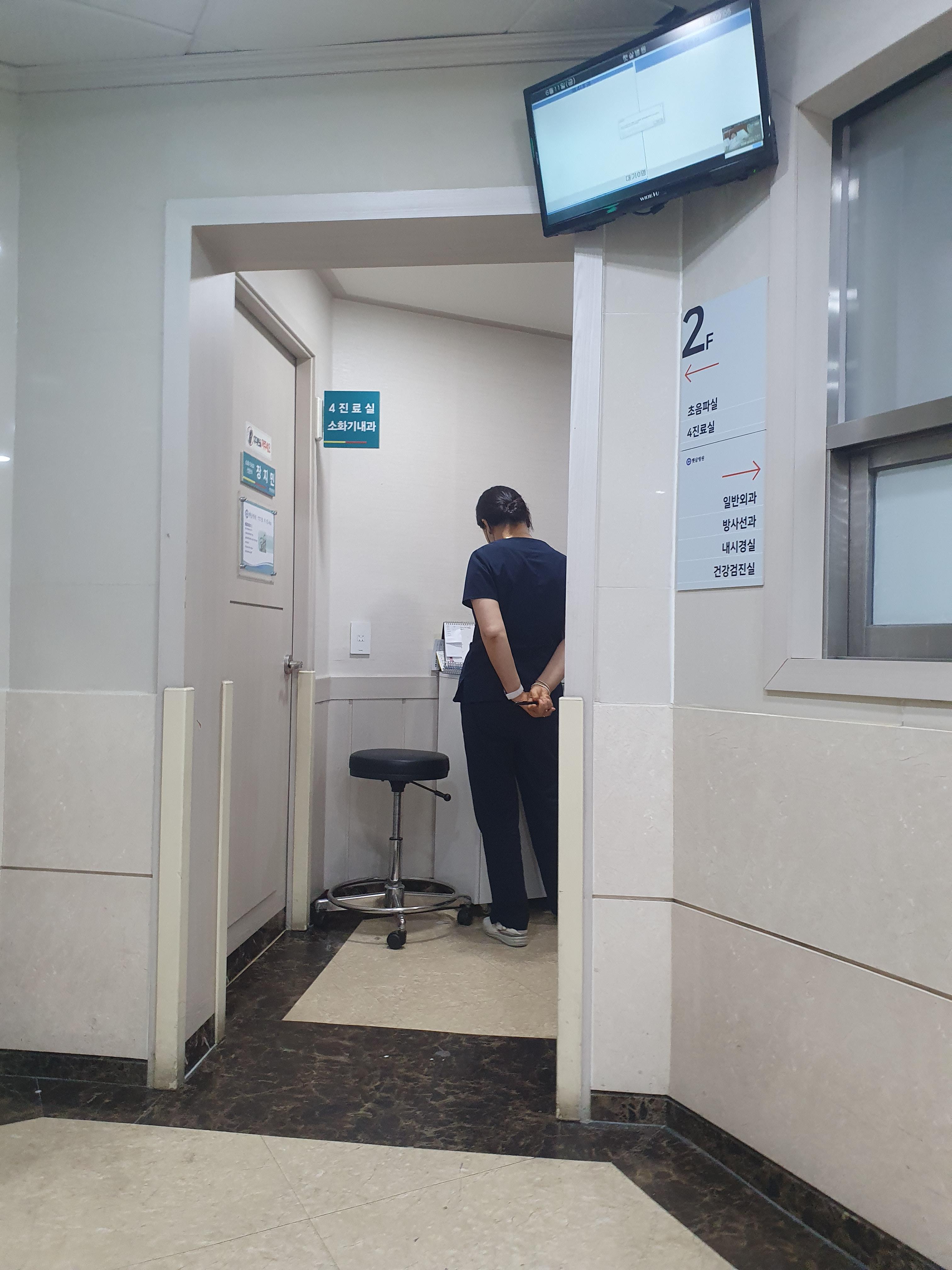 햇살병원 1층에 방문하여 체온측정, 방문객 기록을 하고 2층으로 올라갑니다.