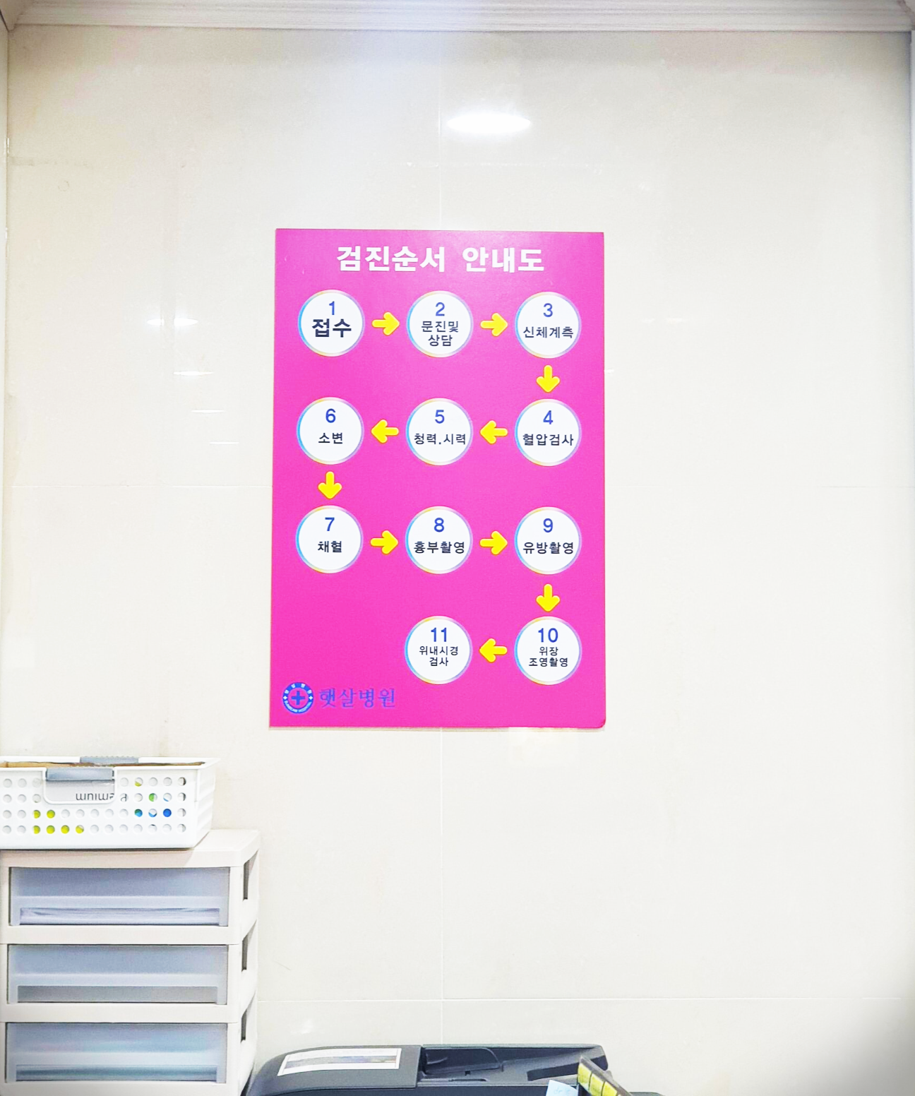 1.접수->2.문진표작성->3.신체계측->4.혈압검사->5.청력,시력->6.소변->7.상담