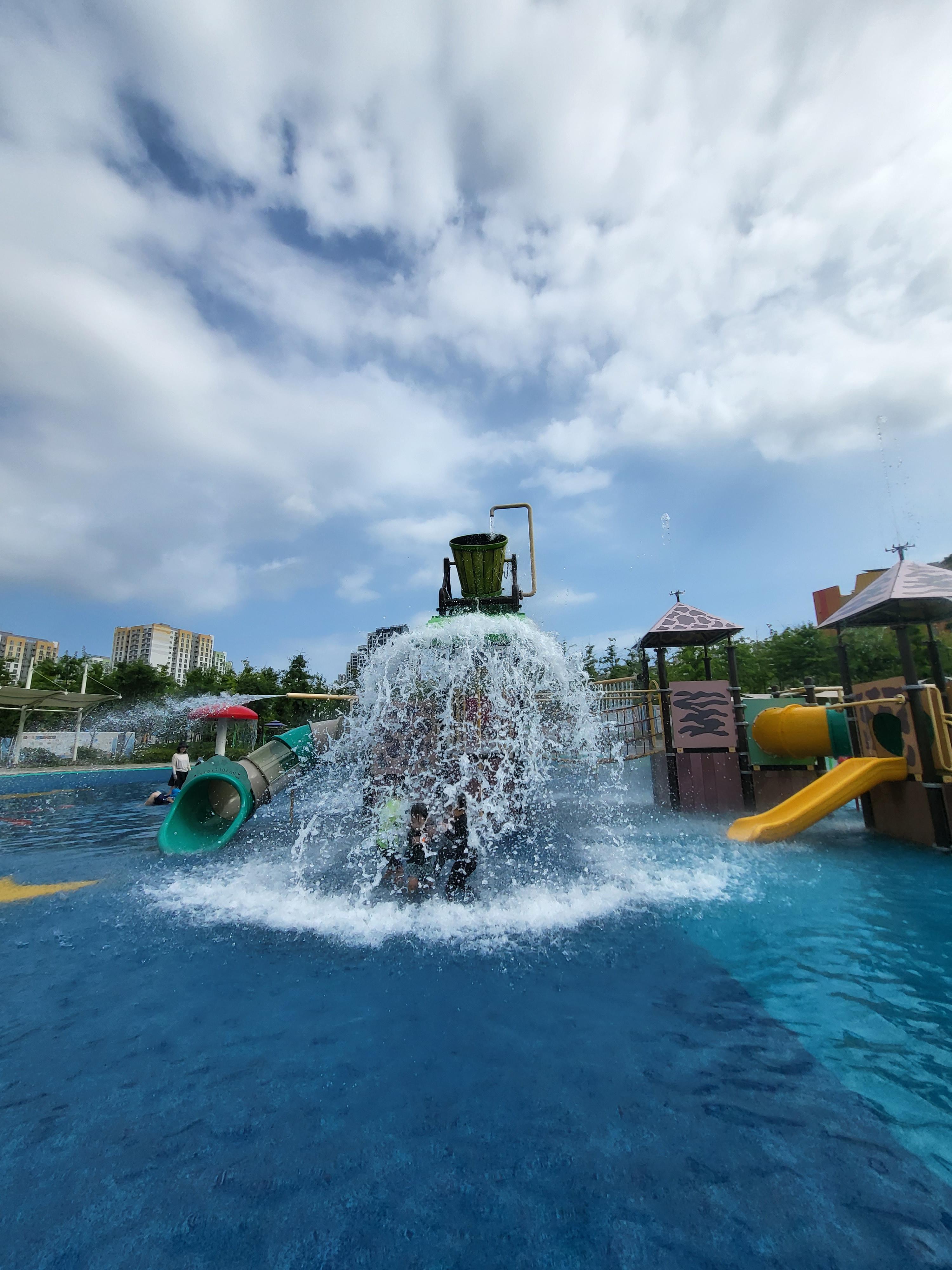 성남 위례 주제공원 물놀이장에는 물만 채워져 있는게 아니라 물이 계속 뿜어져 나와 물놀이의 재미를 더했는데요. 저렇게 물통에 물이 받아져서 다 받아지면 한번씩 확 쏟아지는 걸 아이들이 좋아했어요.