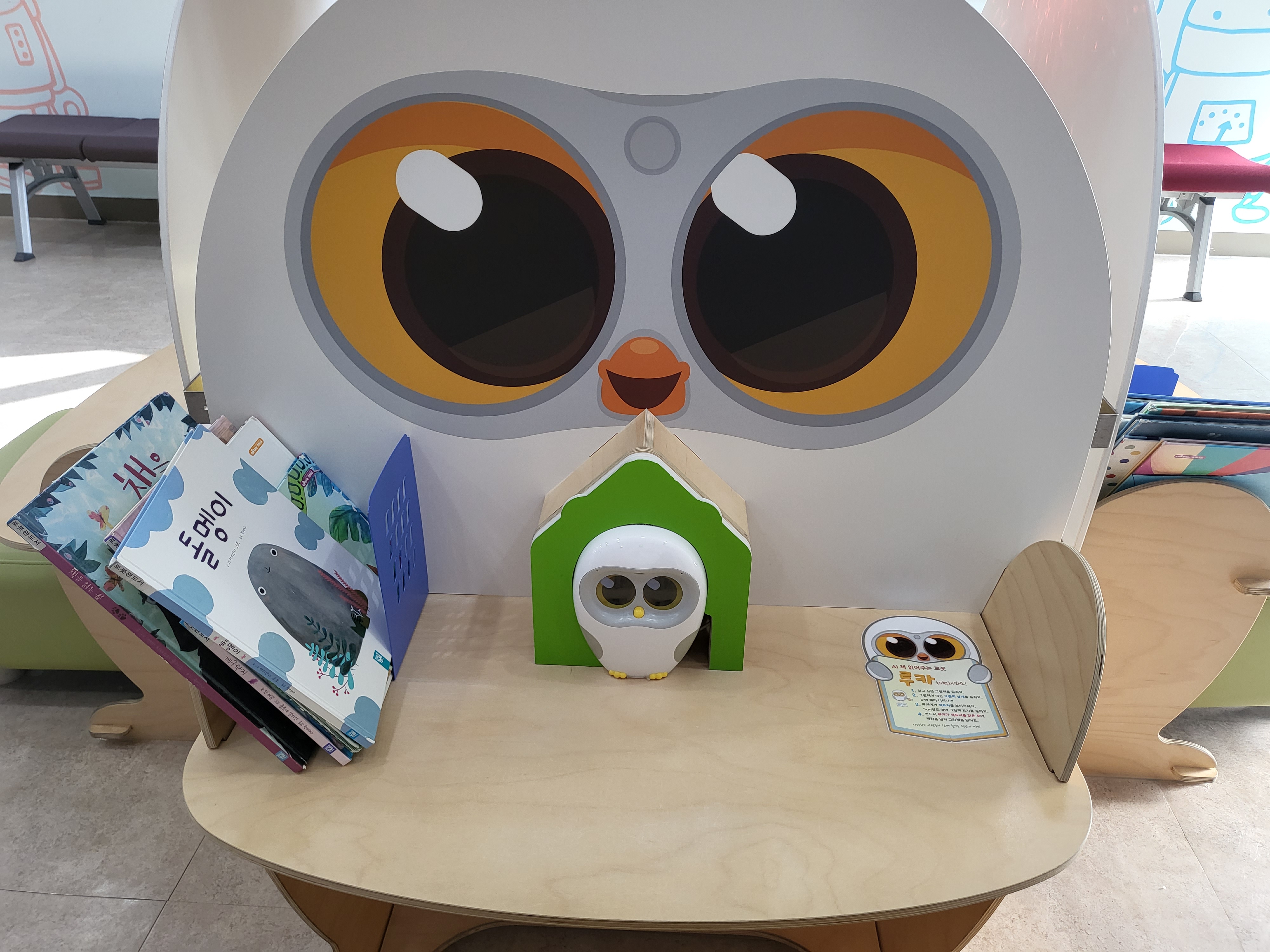 다음은 책읽어주는 로봇 루카입니다. 루카는 책읽어주는 부엉이인데요. 부엉이 날개부분의 버튼을 누르면 눈이 책모양으로 바뀌면서 책의 제목을 인식합니다. 제목을 읽어주면 다음장으로 넘기세요. 책을 읽어줘요.