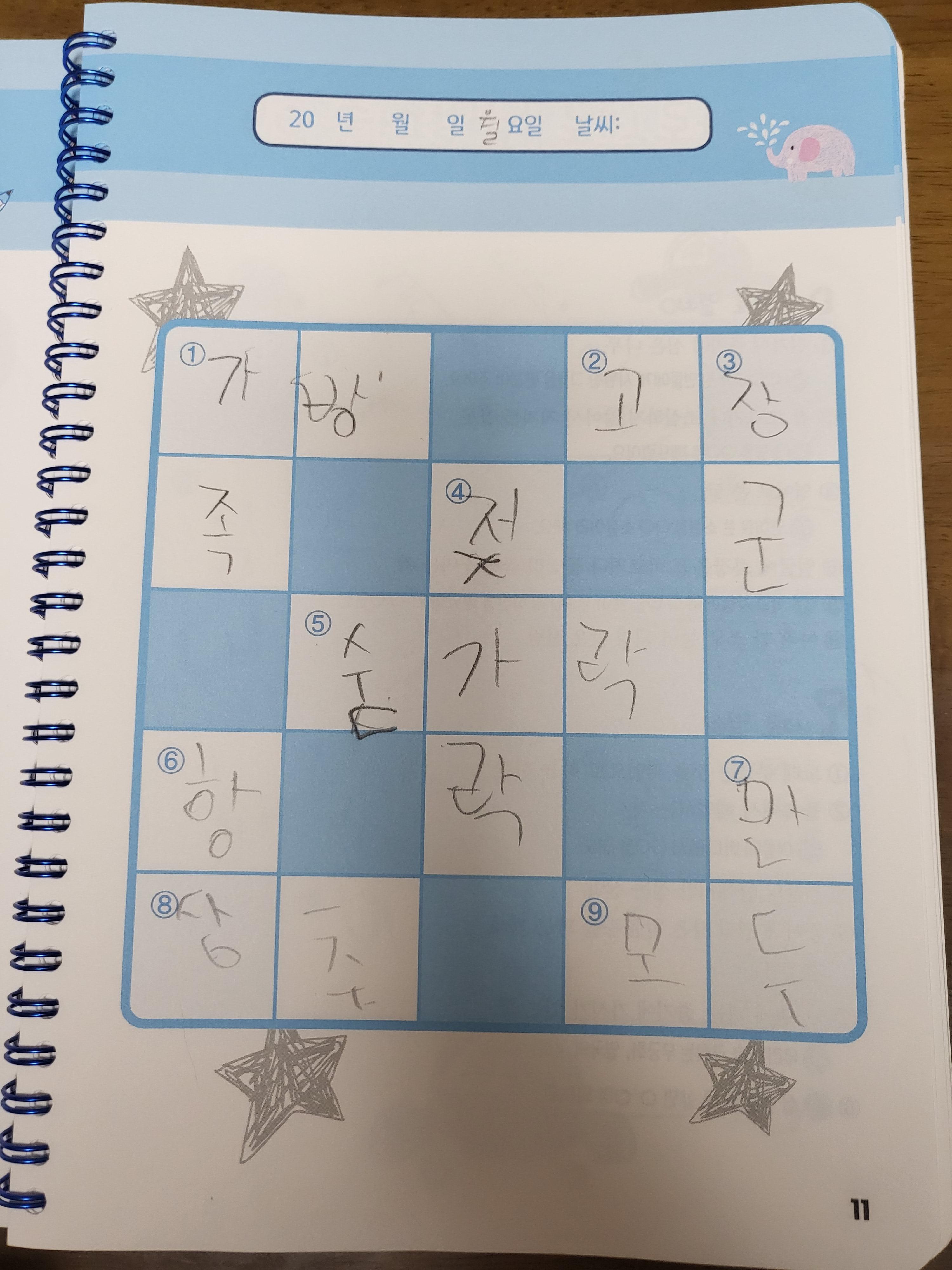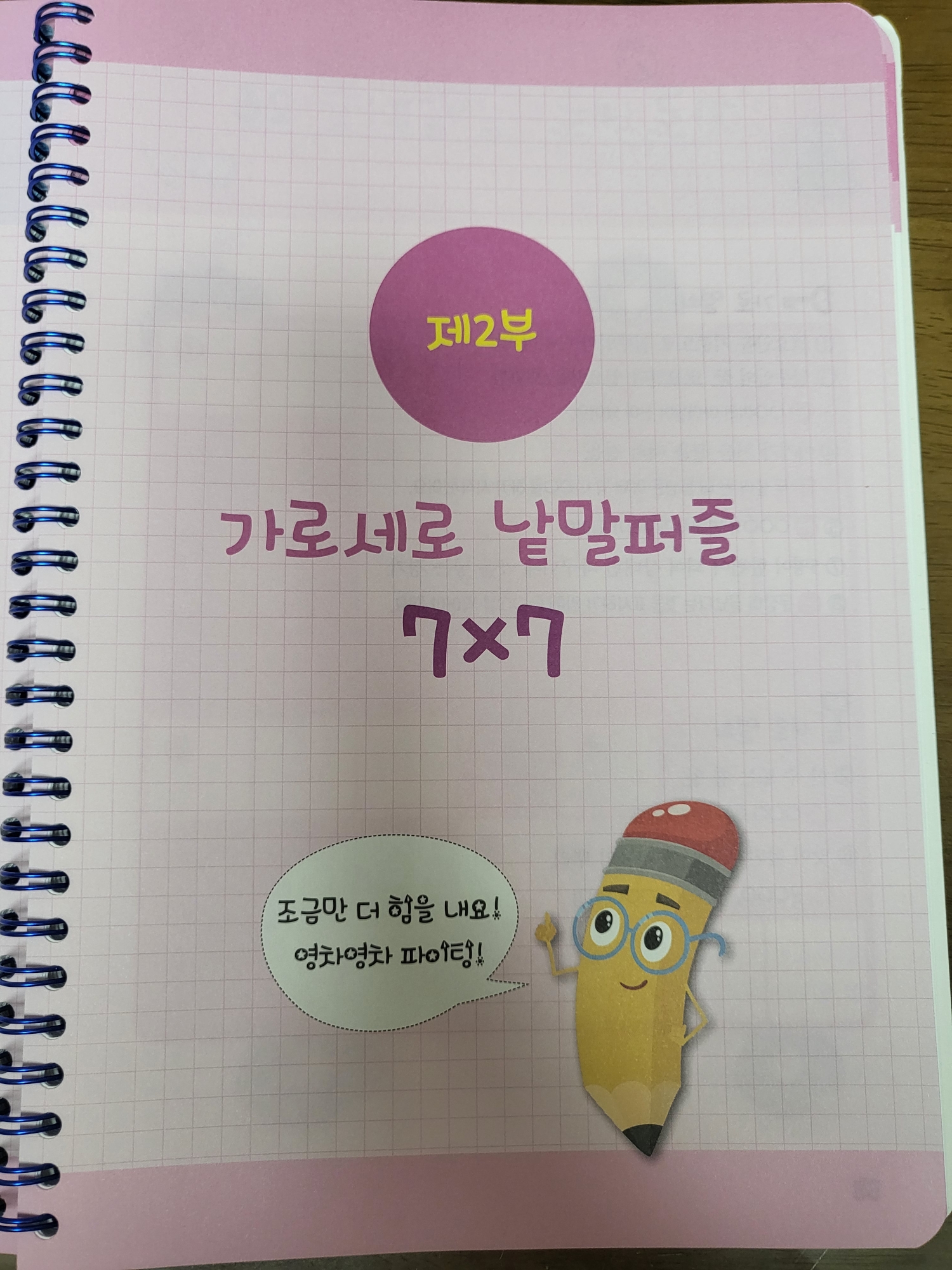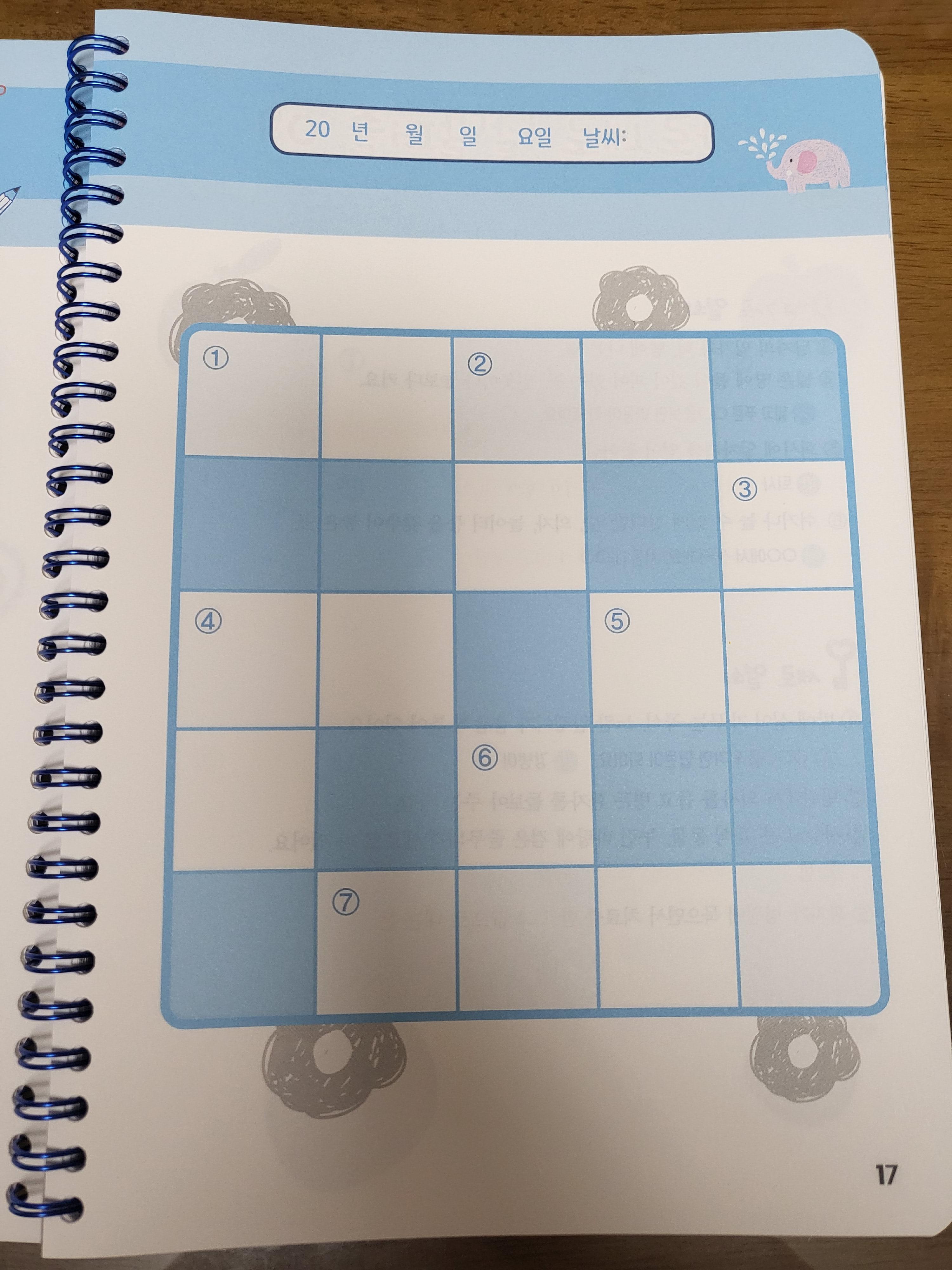 초등교과 어휘왕 가로세로 낱말퍼즐은 7×7로 시작합니다. 때문에 앞서 소개한 스프링북 교과서 가로세로 낱말퍼즐을 먼저 풀고 있어요. 실제로 보시면 위압감이 ㅎㅎㅎ낱말퍼즐의 첫 시작은 5×5가 좋은 것 같아요.
