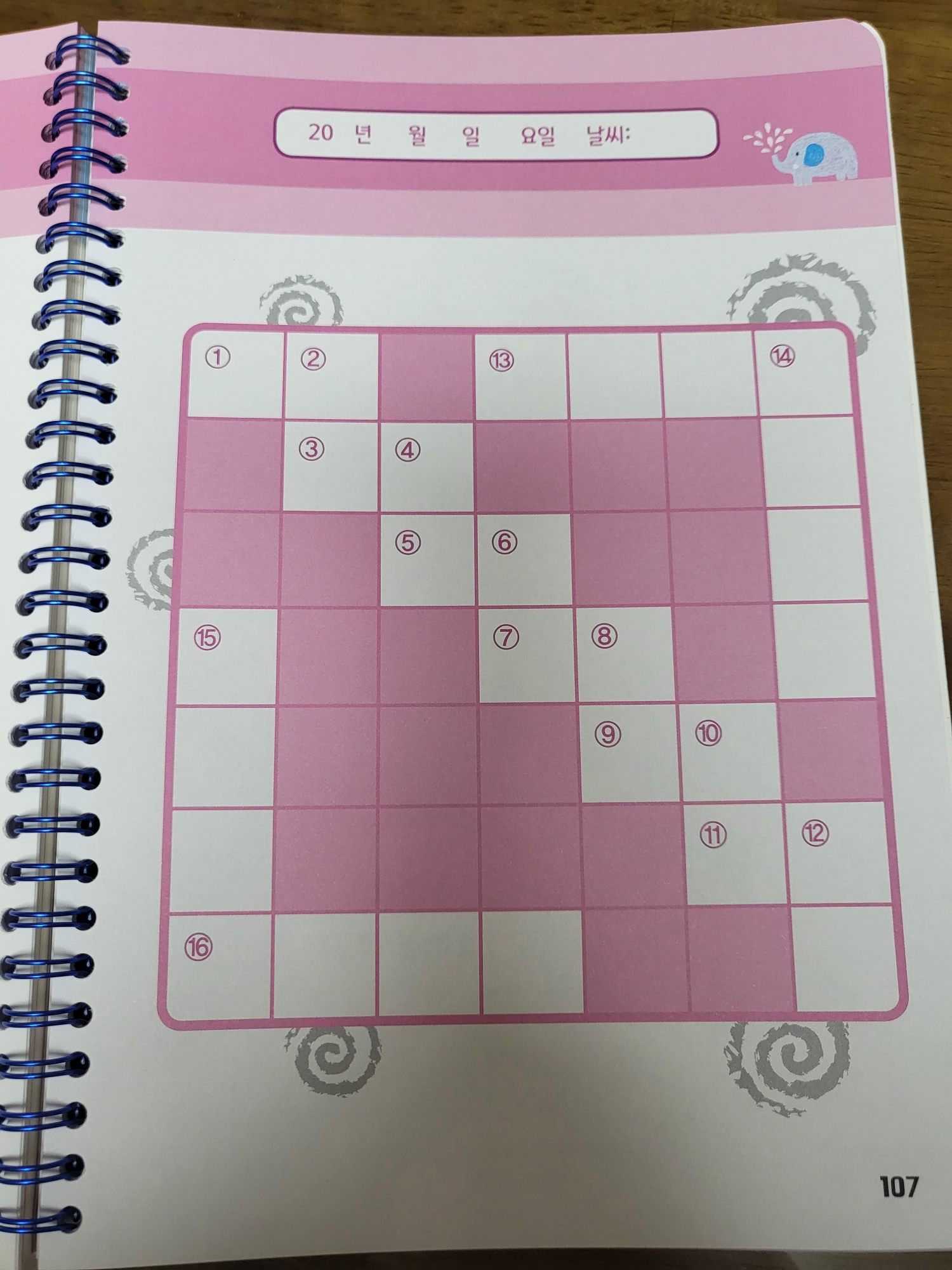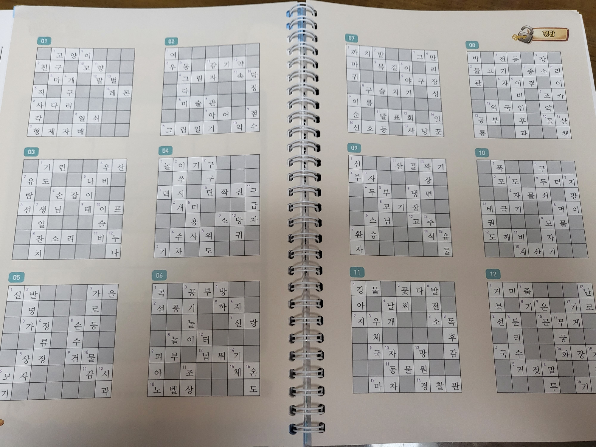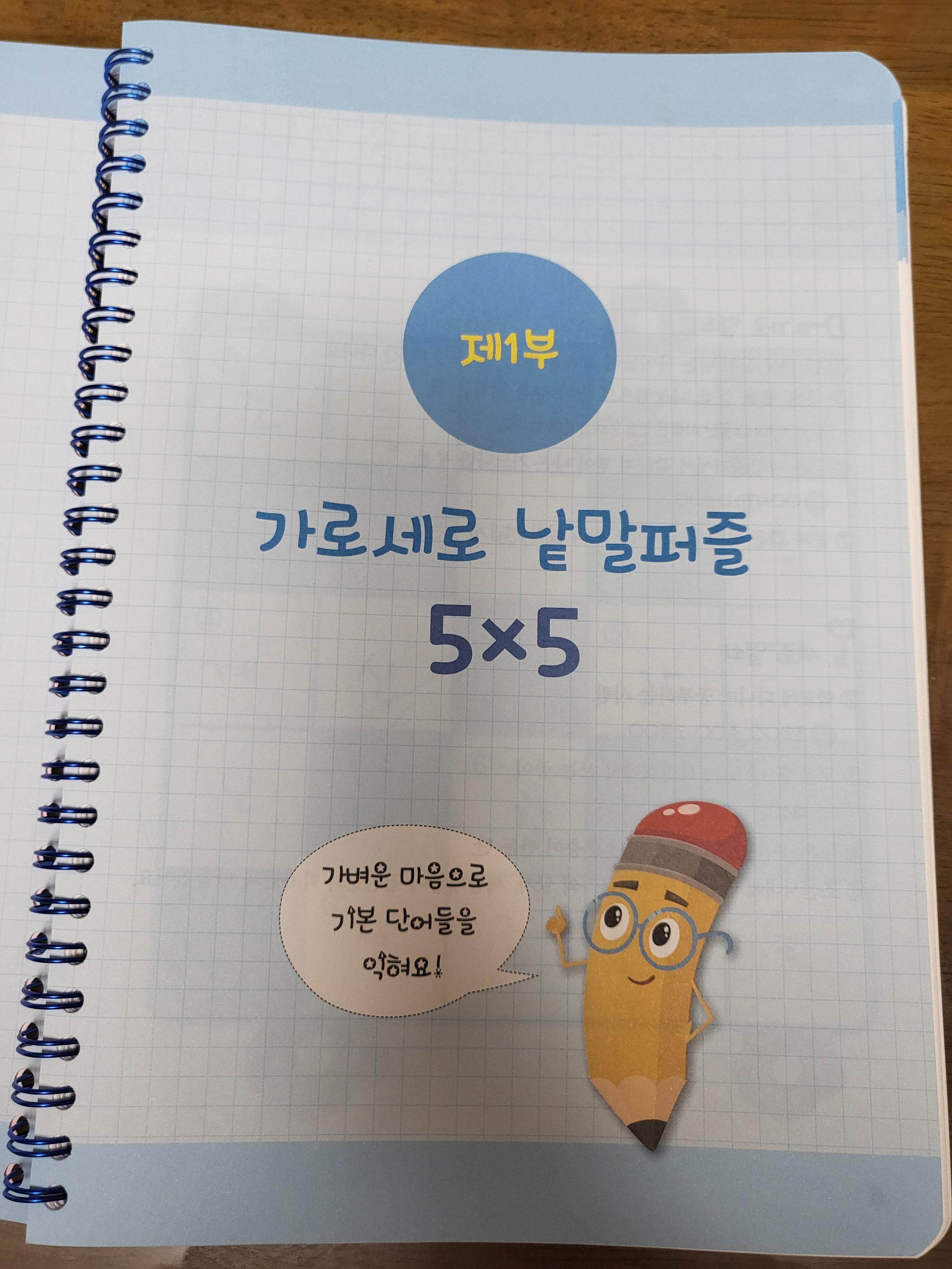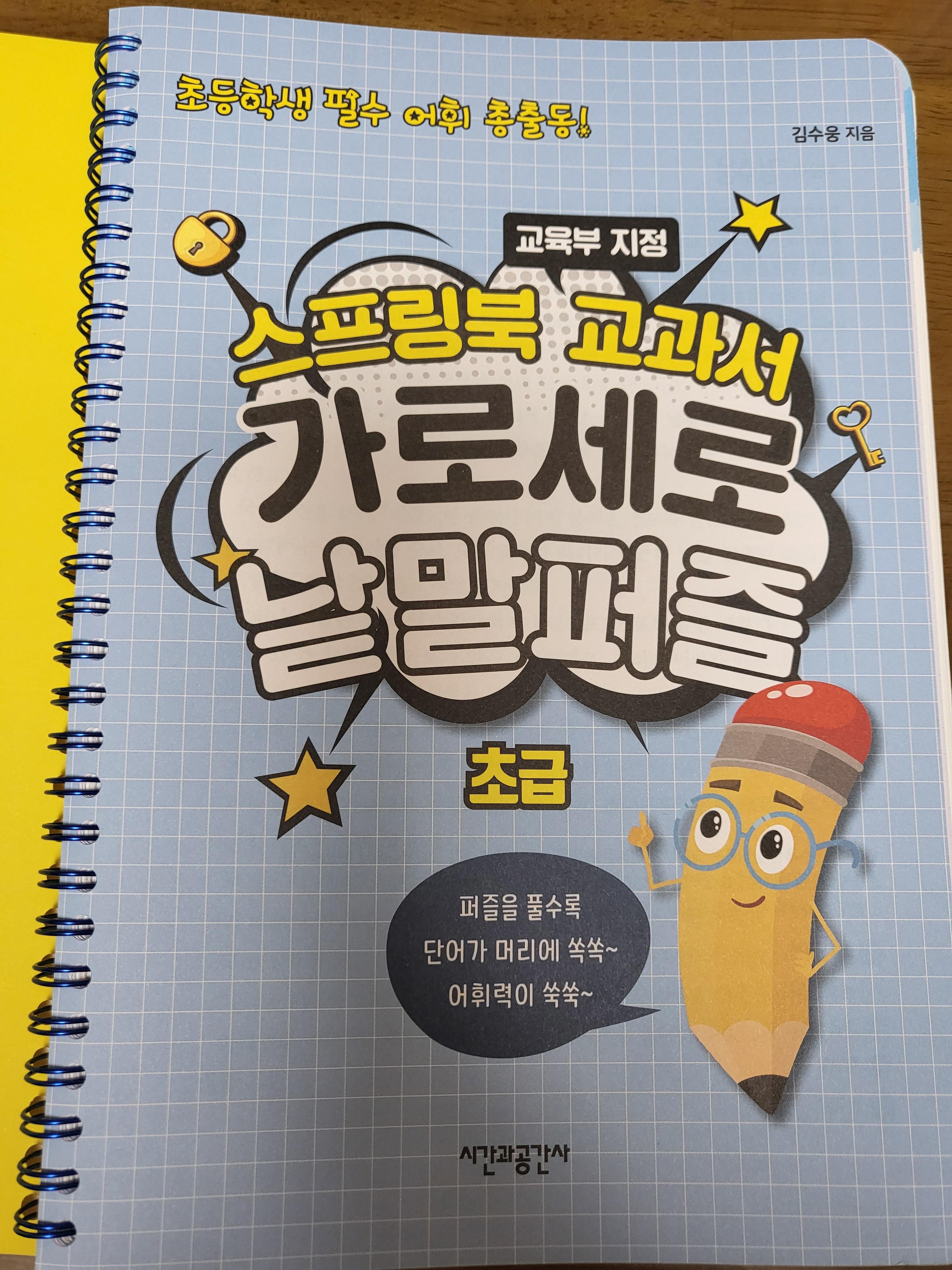 먼저 보여드릴 스프링북 교과서 가로세로 낱말퍼즐 초급은 5×5 퍼즐이고요. 그래서 쉽고, 하나의 퍼즐이 빨리 끝나기 때문에 한번은 엄마가 또 한번은 형이, 나머지 한번은 동생이 글자를 써가며 해봤어요. 스프링북이라 쫙 펼쳐지니 좋더라고요. 보여드릴게요.