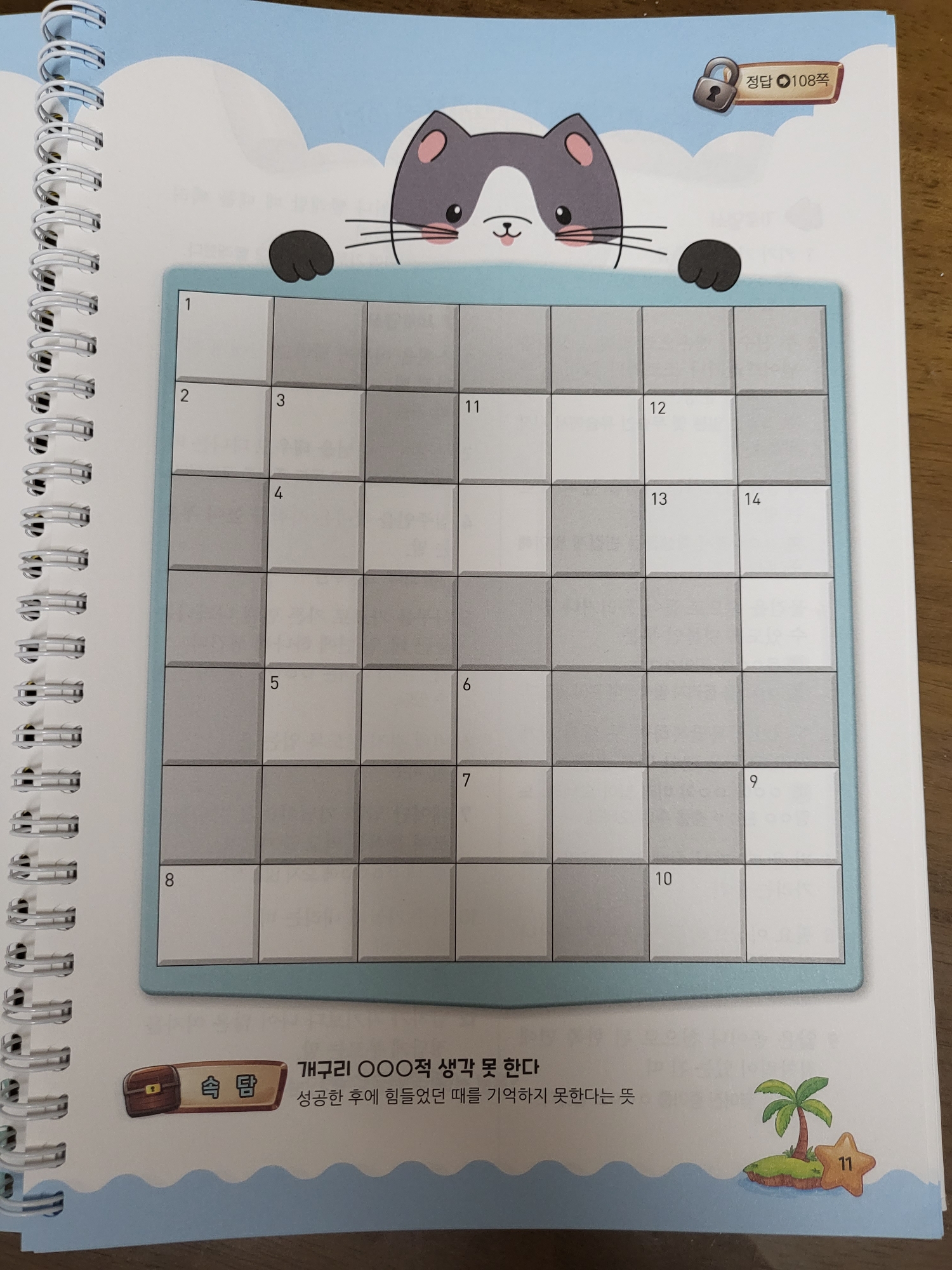 이렇게 7×7 가로세로 낱말퍼즐이 50문제 나와있습니다. 색다른 점은 낱말퍼즐 아래 속담이나 수수께끼가 나와있다는 거에요. 퍼즐을 하면서도 아이들과 즐기실 수 있을 듯 합니다. 역시 뒤쪽에 정답이 나와있습니다.
